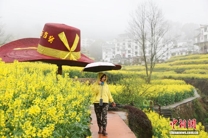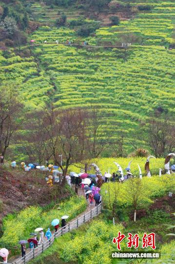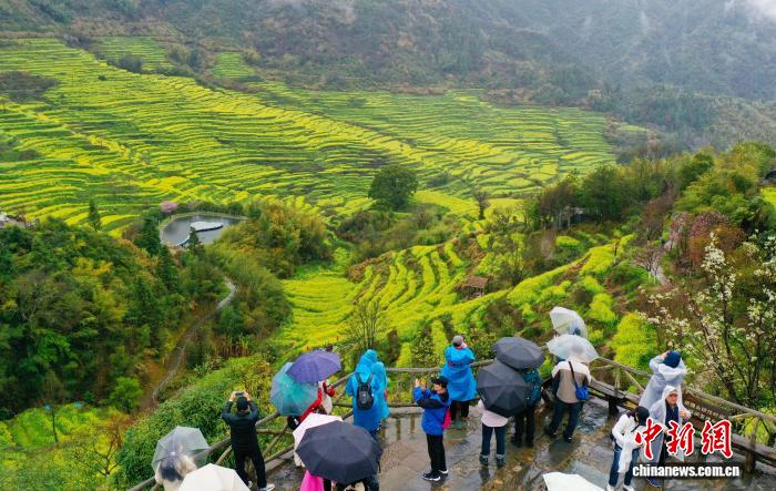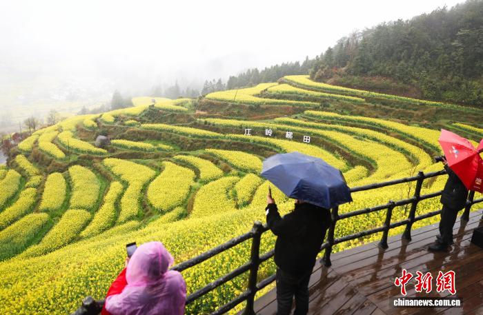 今日江西婺源县江岭景区,别名乘客冒雨正在油菜花海中赏花摄影。中新社记者 刘占昆 摄